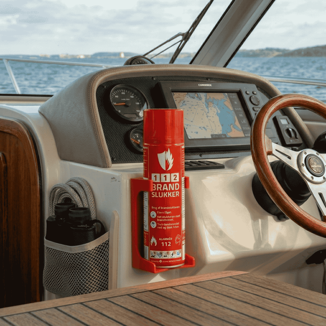 På båden kan en lille gnist hurtigt blive alvorlig. 112 BRANDSLUKKEREN tåler fugt, saltluft og bevægelse og slukker både olie-, benzin- og el-brande ombord. Og så fylder den stort set ingenting.